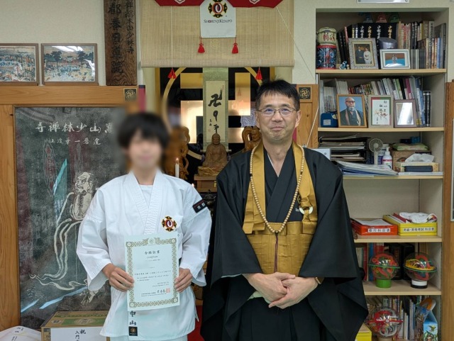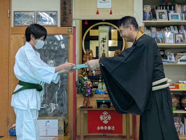 中学3年生 拳士の6級合格証書が、一般社団法人SHORINKEMPO UNITYより届きましたので、昇級考試合格の合格証書授与式を、京都春日道院 専有道場において行いました。