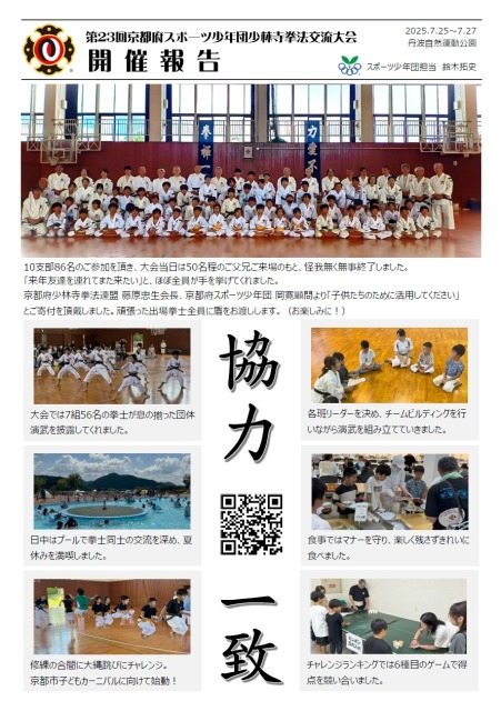 | 2025.06.23 洛南スポーツ少年団 2025年京都府大会に参加しました 洛南スポーツ少年団からは親子2組3名、茶帯の部1組、緑帯の部2組3名、白黄帯の部3組が出場しました。惜しくも入賞を逃した拳士には、支部長より敢闘賞を贈りました。... | |