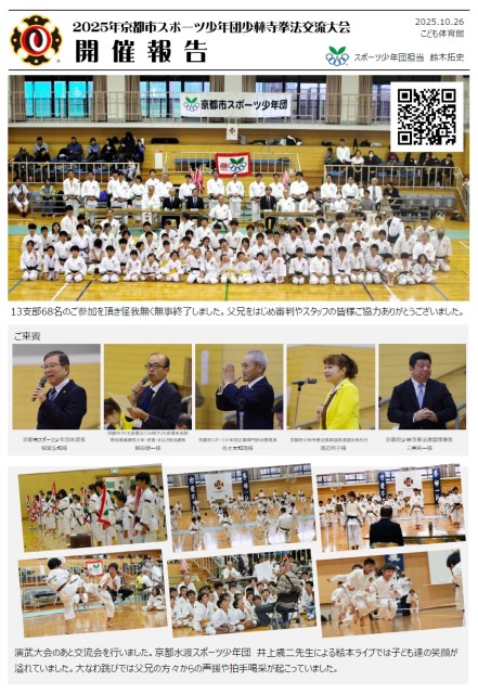 10月26日(日)、京都市こども体育館で行われました「2025年京都市スポーツ少年団少林寺拳法交流大会」に出場しました!初めての大会出場で入賞!さらには、開会宣言も務めました!!入部以来、休まずにコツ...