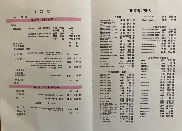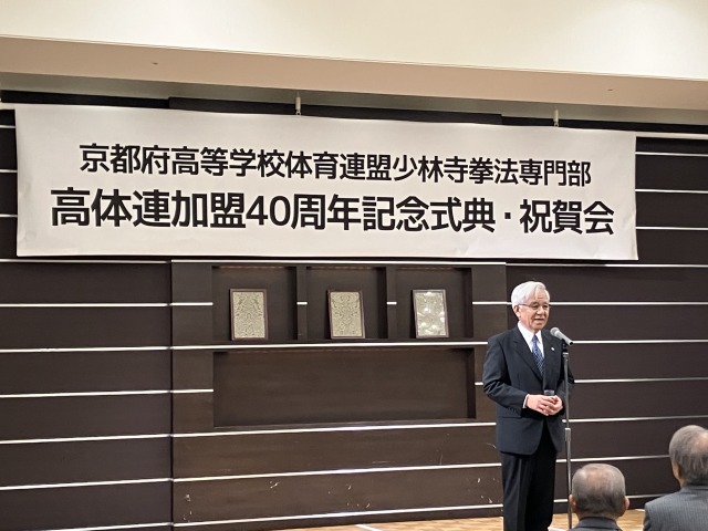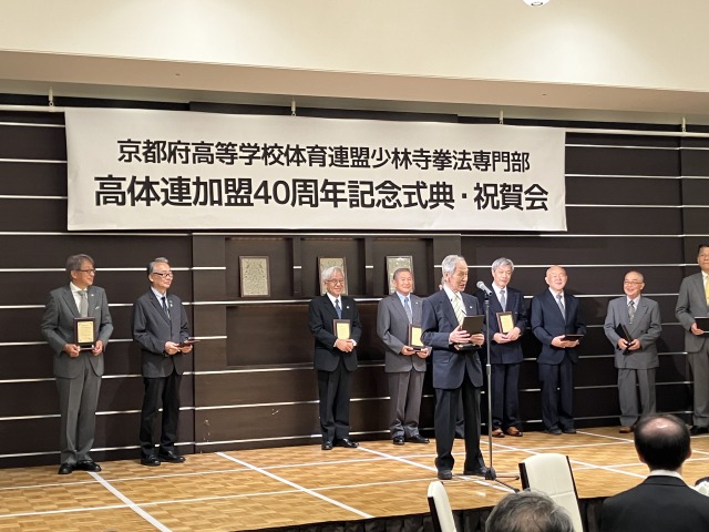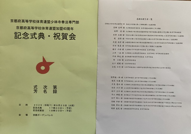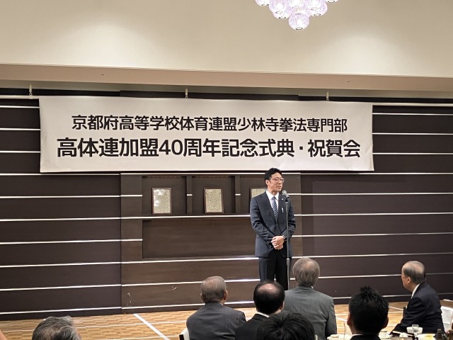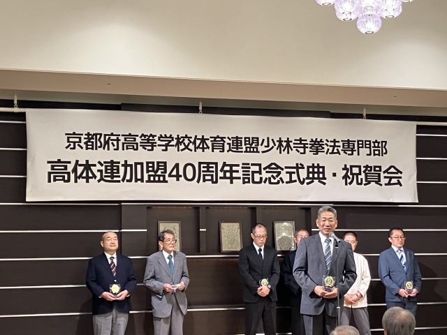 ブログ京都府高等学校体育連盟加盟40周年記念式典・祝賀会 2025年9月24日9月23日(祝)京都府高等学校体育連盟加盟40周年記念式典・祝賀会が京都ガーデンパレスにて行われました。京都府が高等学校体育連盟に加盟したのは全国で2番目。諸先輩方の並々ならぬ熱意と行動力によって加盟することが出来きたと聞いております。その諸先輩方に感謝の意を込めて感謝状をお渡しさせていただきました。これから50年、100年と続けて、京都府少林寺拳法連盟の発展を参加者全員で誓いました。